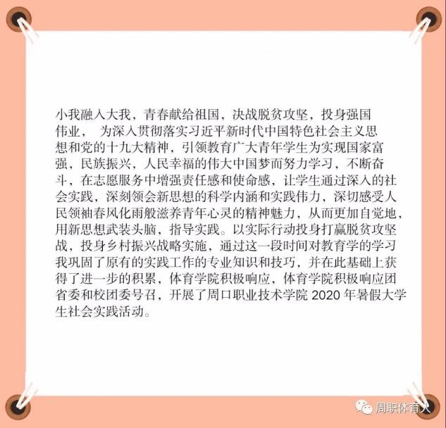 周口职业技术学院体育学院“阳光体育”志愿服务队在李海磊、史帅两位老师的带领下开展了为期十余天的社会实践活动,光阴似箭,岁月如梭,社会实践生活也接近尾声,一直以来,每个队员对社会体育志愿社会实践事业充满了热诚。在实践工作中都能够求真务实、开拓进取、大胆创新、乐于奉献,努力做好每次实践活动,圆满地完成本职工作。在学习实践中,更能够严格要求自己,以身作则,凡是要求学生做到的,自己先要做到。